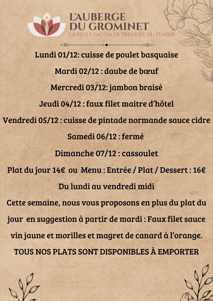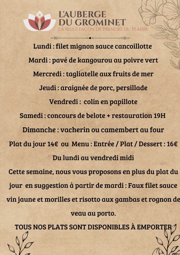 L’Auberge du Grominet vous propose un menu du jour avec entrée, plat et dessert modifié tous les jours du lundi au vendredi midi, en plus nous vous proposons des suggestions pour la semaine qui permette de ravir chacun d’entre vous, alors n’hésitez pas à réserver.